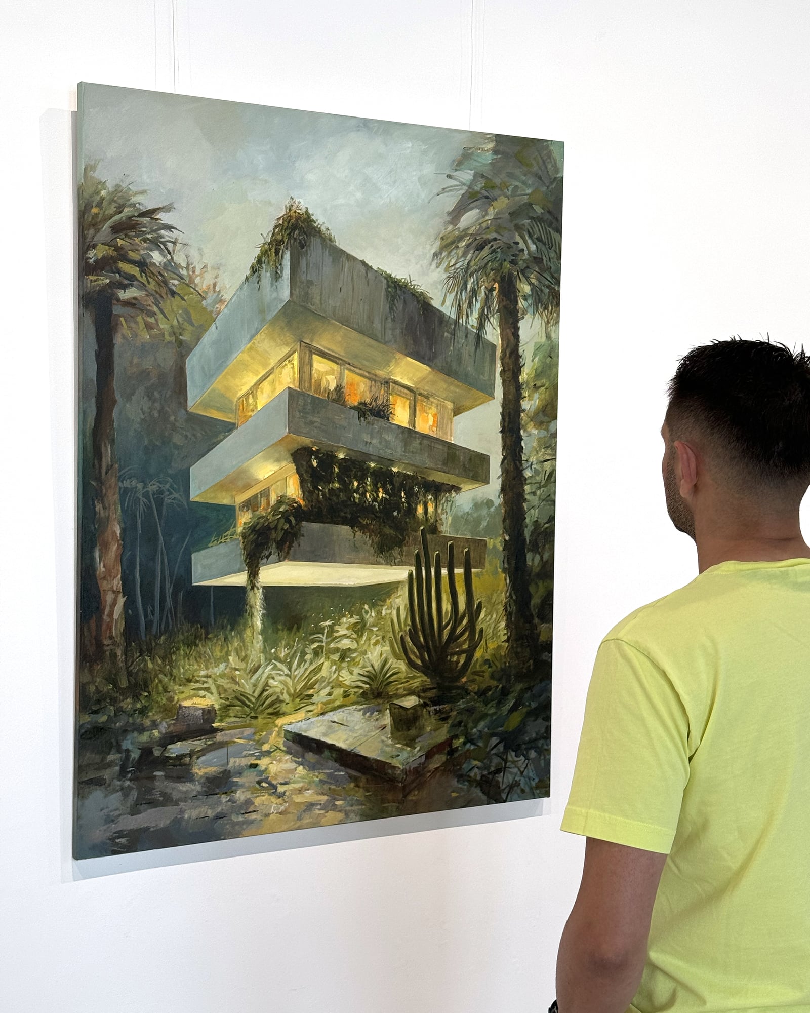 "BY Residence" portrays a modernist home warmly lit from within, set amidst lush vegetation. The serene, harmonious atmosphere of the painting, with its integration of contemporary architecture and nature conveys a sense of balance and sustainability. Work can be seen as echoing René Magritte's "Empire of Light," where contrasting elements of day and night create a surreal yet cohesive scene. Similarly, "BY Residence" juxtaposes the warmth of the illuminated residence with the cool, tranquil surroundings, blending them into a unified, peaceful composition.